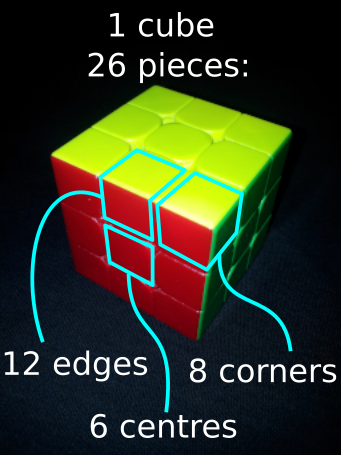 A cube has 26 pieces: 8 corners, 12 edges, and 6 centres.