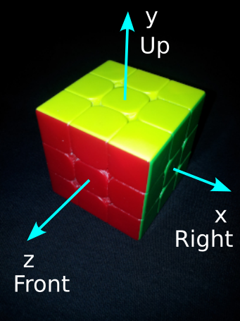 A cube has 6 faces: Right (+x), Left (-x), Up (+y), Down (-y), Front (+z), and Back (-z). Another way to identify faces is by the colour of their centres (regardless of the colours on other pieces).